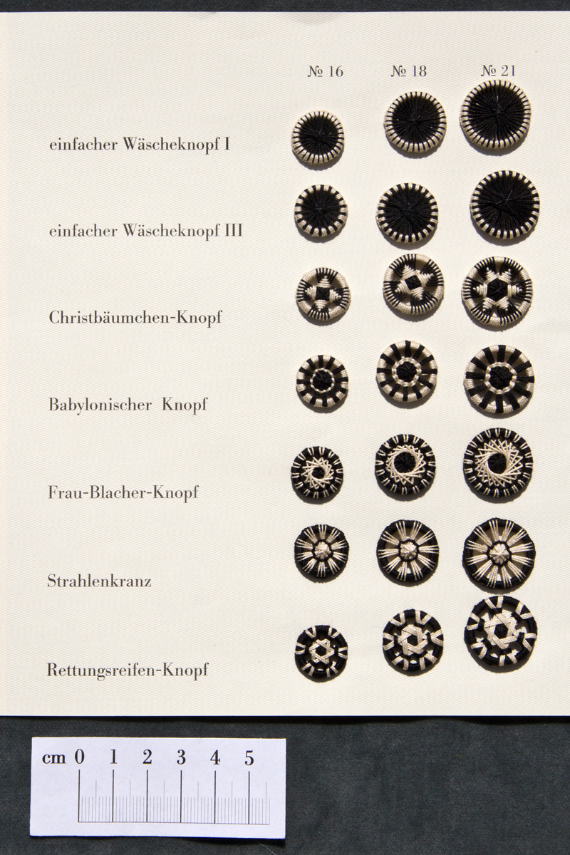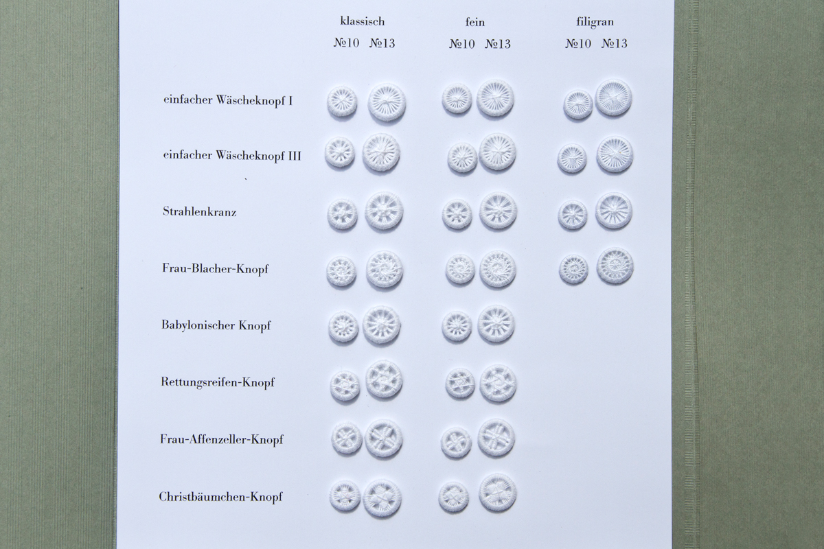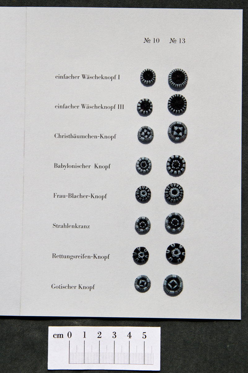 Die gängigsten Zwirnknopf-Modelle in den Größen 10, 13, 16, 18 und 21 aus Baumwollzwirn. Diese Knöpfe passen sehr gut auf Trachten- und Landhausmode. Der Wäscheknopf III in Größe 13 ist nicht verlorengegangen, sondern es gibt ihn in dieser Feinheitsstufe nicht.