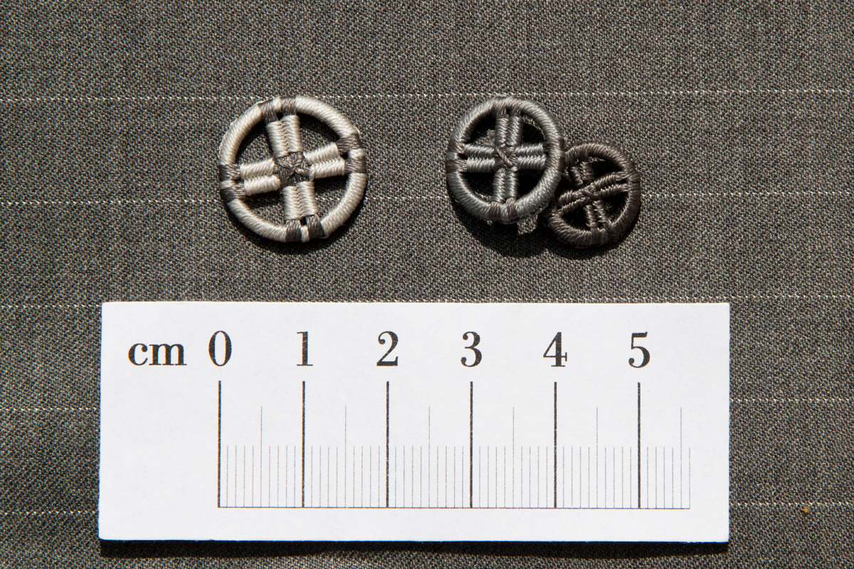 Westenknöpfe aus Seidenzwirn ganz nach klassischem Vorbild aus dem 17. und 18. Jahrhundert: Hier auf einem feinem Nadelstreif. Die beiden Knöpfe rechts sind als Doppelknopf ausgeführt, d.h. man könnte sie auf der Weste durchknöpfen und, wenn die Knöpfe farblich unterschiedlich gearbeitet sind, entweder die eine oder die andere Seite außen tragen; oder man kann die Doppelknöpfe als Manschettenknöpfe tragen, genau passend zum Anzugsstoff.