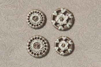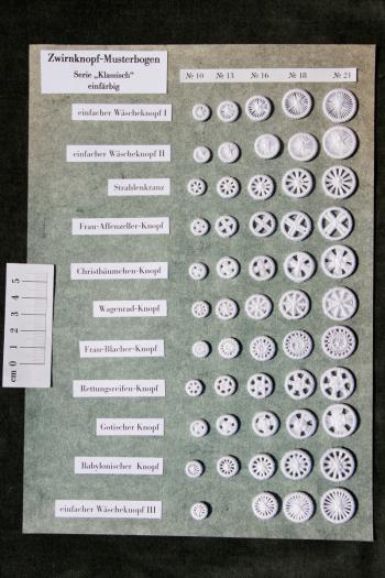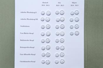 Zwirnknöpfe in den Größen 10 und 13 aus weißem Baumwollzwirn in drei Feinheitsstufen: „Klassisch“, „Fein“ und Filigran“; für Herrenhemden oder Damenblusen.